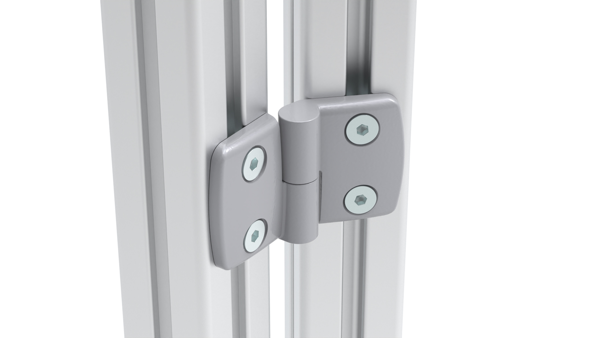 für Flächenelemente und Aluminumprofile, pro Scharnierflügel je ein Steckplatz für Zentrierbolzen, Scharnierachse in Buchsensystem gelagert