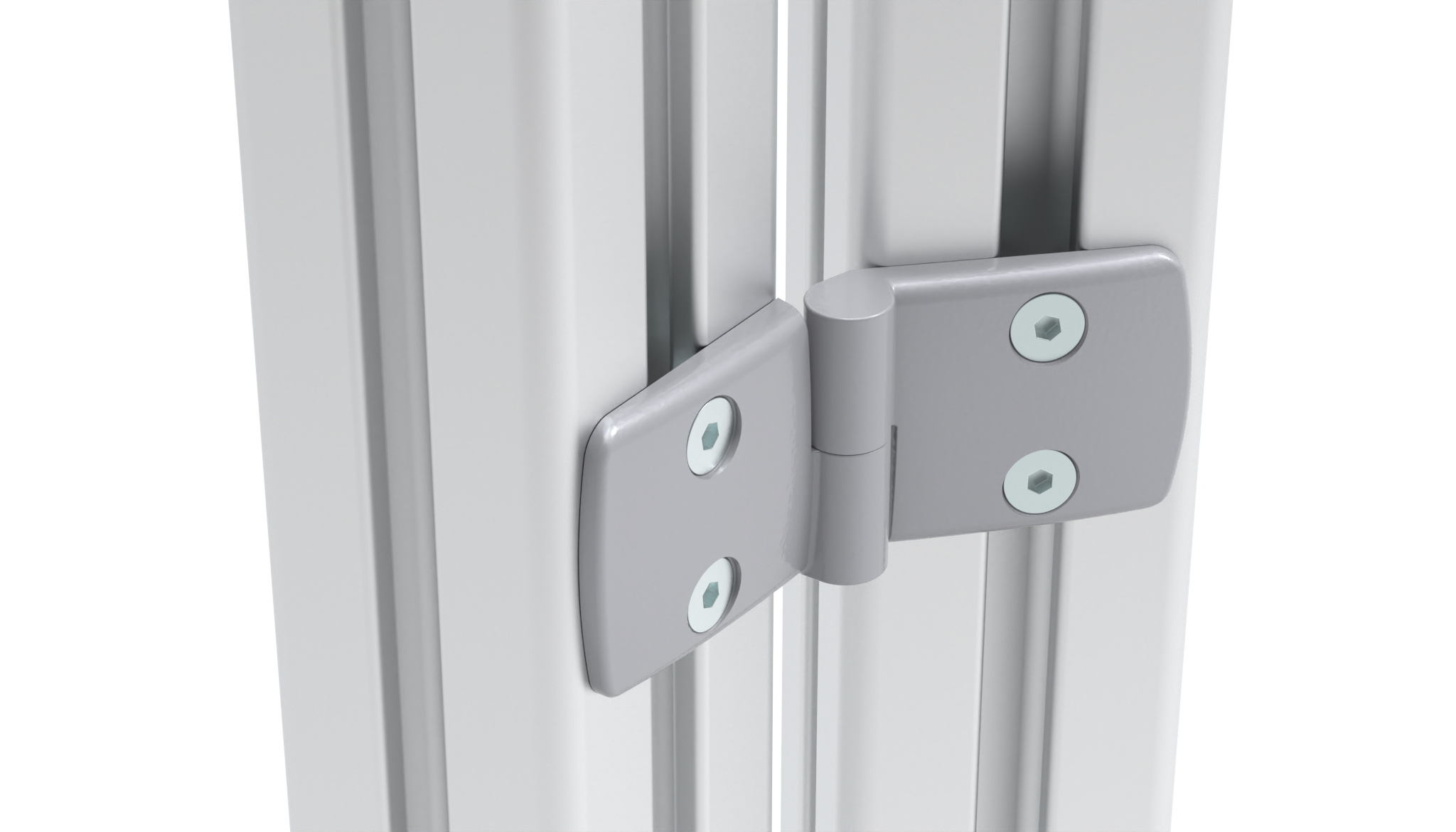 für Flächenelemente und Aluminumprofile, pro Scharnierflügel je ein Steckplatz für Zentrierbolzen, Scharnierachse in Buchsensystem gelagert