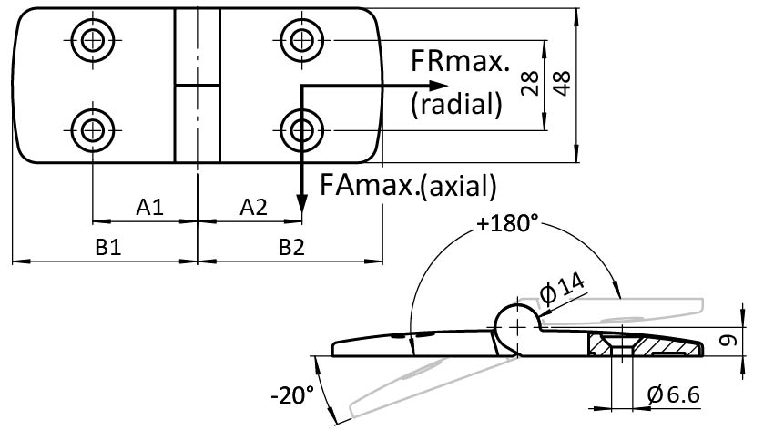 | Teil-Nr. | Ausführung | Kombination | FAmax (N) | FRmax (N) | A1 (mm) | A2 (mm) | B1 (mm) | B2 (mm) |