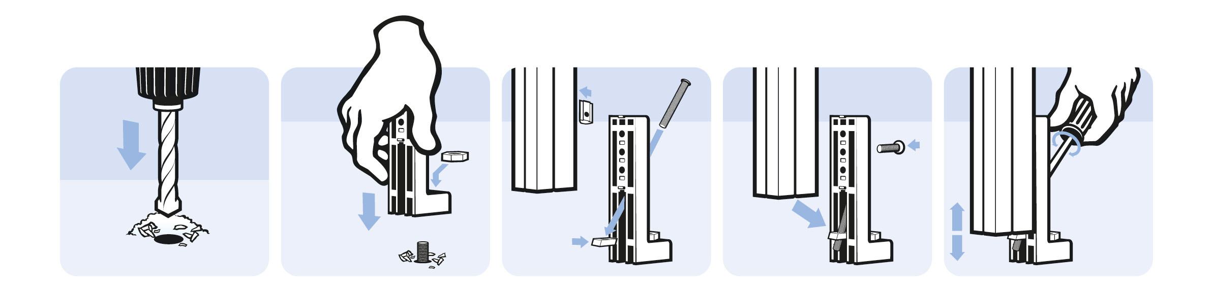 zur höhenverstellbaren Verbindung von Aluminiumprofilen mit dem Boden, inkl. Justierschraube und Gewindeplatte