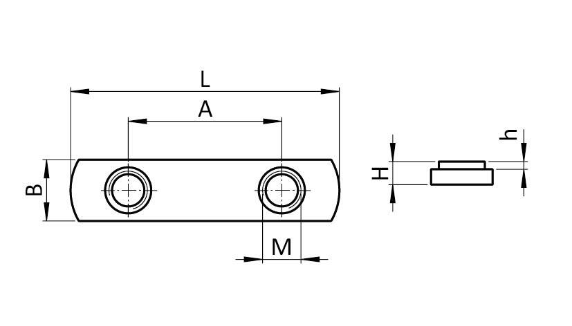| Teil-Nr. | A (mm) | B (mm) | H (mm) | h (mm) | L (mm) | M | Material | Nut N (mm) | Raster |