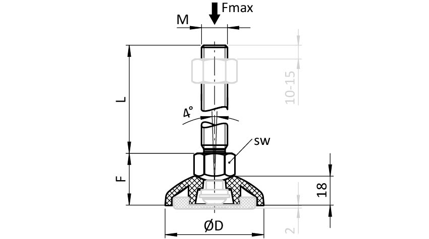 fester, nivellierbarer Stellfuß zum Ausgleich von Bodenunebenheiten