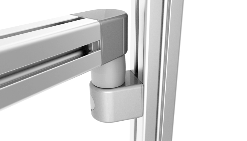 Friktionsgelenk kann längs, quer oder stirnseitig am Profil angebracht werden; bei der stirnseitigen Anwendung muss an der Kernbohrung ein Gewinde M8 vorhanden sein (mind. 15 mm tief)