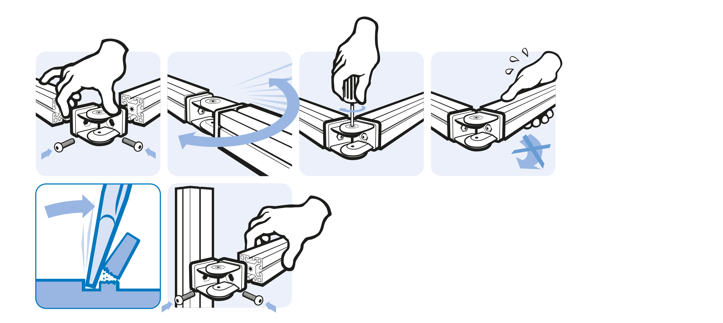 zur beweglichen Verbindung von zwei Profilen oder Flächenelementen, mit oder ohne Führungsnasen für Nut 6; mittels der Schrauben kann der Reibungswiderstand des Gelenkes stufenlos reguliert, bzw. das Gelenk in einer definierten Position fixiert werden