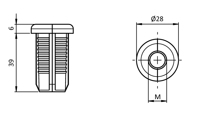 zur Befestigung von Stellfüßen und Lenkrollen an der Stirnseite von Rundrohrprofilen D28L mit Außendurchmesser ø 28 mm