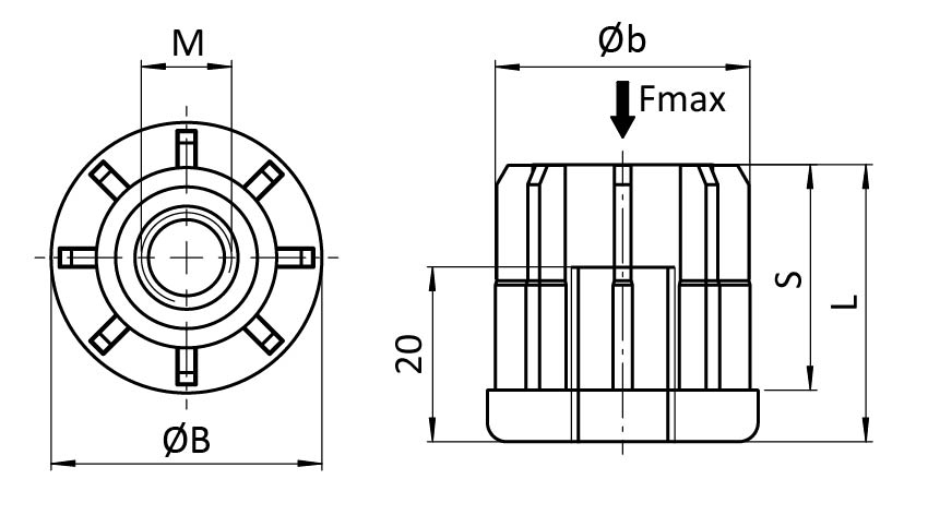 | Teil-Nr. | Fmax (N) | B (mm) | b (mm) | L (mm) | M | S (mm) | Rundrohr (mm) |