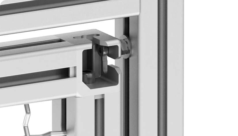 zur rechtwinkligen Verbindung von zwei Aluminiumprofilen und zum Einhängen eines Rahmenelementes in eine Rahmenkonstruktion mittels geeigneter Aufhängung; obere Aufhängung definiert die Position, Verriegelung erfolgt durch nachträgliches Verschieben der unteren Aufhängung