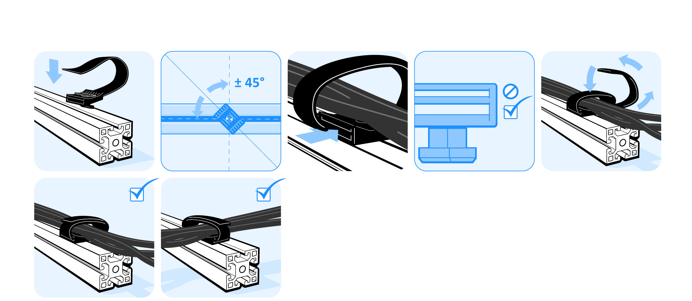 zur Befestigung von Kabeln sowohl längs als auch quer zum Profil ohne zusätzlichen Kabelbinder, wiederverschließbar; Montage mittels einer Achteldrehung in der Nut