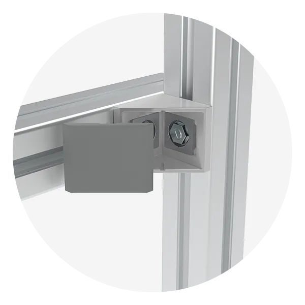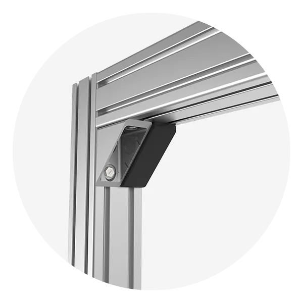 Da die FATH Aluwinkel M (Set) die Stützweite der Rahmenkonstruktion vergrößern, eignen sie sich auch für die Verstärkung von rechtwinkligen Profilverbindungen. So sind höhere Momentbelastungen ohne zusätzliche Profilbearbeitung möglich. Hierfür können auch mehrere Winkel parallel montiert werden.