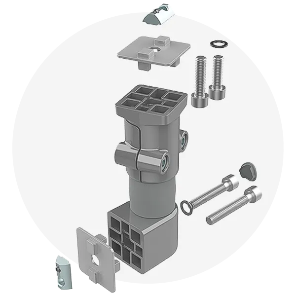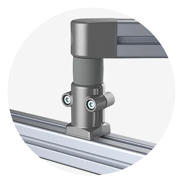 Diese stabile Anbindung an Profile mit Nut 8 oder Nut 10 ist bestens geeignet für den Bau individueller Lösungen. Der Anschlussadapter M8 kann sowohl längsseitig als auch stirnseitig am Profil befestigt werden. Bei Verwendung der Nutfixierungen kann die zentrale M8 Anschraubung gegen Verdrehen gesichert werden.