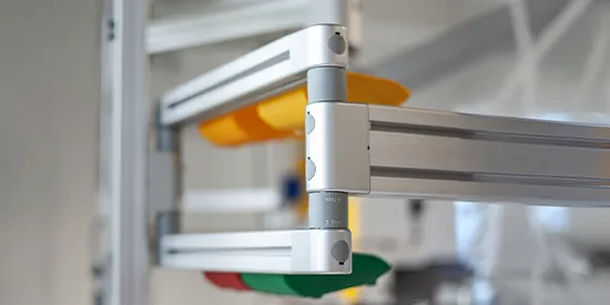 Durch reines Schwenken lässt sich der fertige Systemarm multidimensional an unterschiedliche Arbeitspositionen und Werkstück-, Produkt- oder Körpergrößen anpassen.