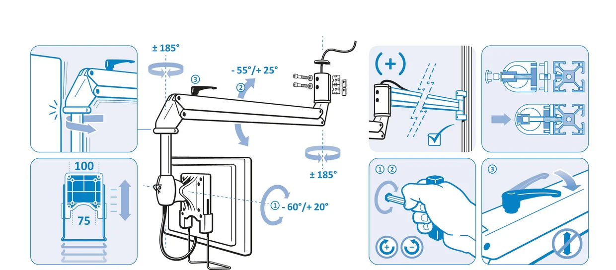 Der FATH Monitor Schwebearm SKY wird an der Wand in beliebiger Höhe montiert. Wird der Monitor nicht benötigt, kann der komplette Schwebearm mit einem Handgriff nach oben oder zur Seite weggeschoben werden. Der gesamte Raum unter dem Schwebearm ist frei und kann ohne jede Einschränkung für alle Arbeiten genutzt werden – auch für raumgreifende Tätigkeiten, die aufrechtes Stehen oder das Umhergehen im Arbeitsbereich erfordern. Der Monitor-Schwebearm SKY ist zusätzlich mit einem Feststellhebel ausgestattet. Damit kann der Monitor in der für Sie idealen Position fixiert werden.