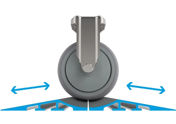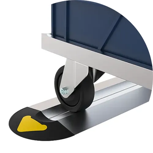 Dies gewährleistet das einfache Ein- und Ausparken sowie sicheren Halt für leichtere und schwere Bodenroller. Da der Widerstand beim Auffahren auf die Schienen sehr gering ist, erfolgt das Handling der Bodenroller fließend und rückenschonend – ein Plus für die Ergonomie am Arbeitsplatz.