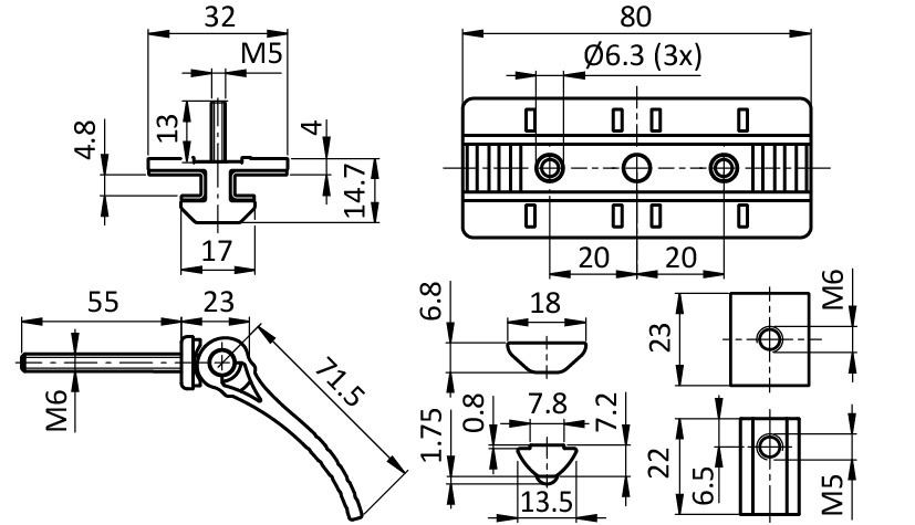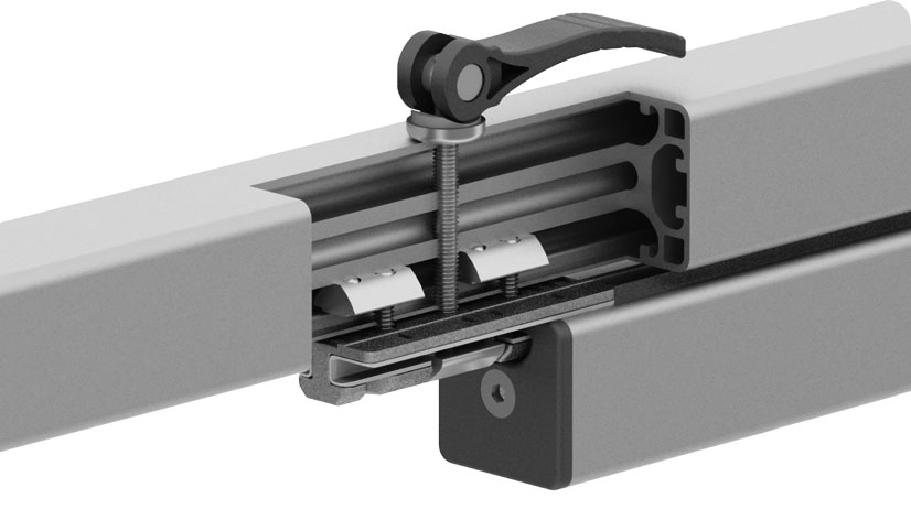zur gleitenden Führung von Profilen mit Nut 8, Loslager*; zusätzliche Klemmung des Schlittens erhöht die Einsatzmöglichkeiten, z. B. als schnell verstellbarer Endanschlag