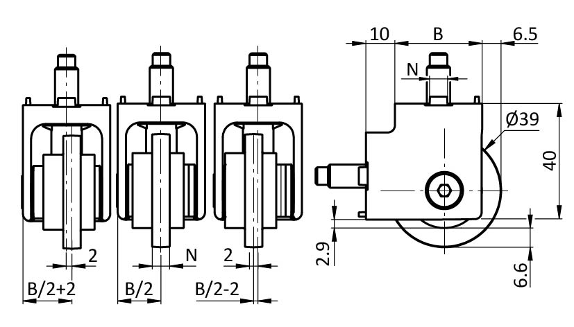 zur rechtwinkligen Verbindung von zwei Aluminiumprofilen und zur Führung von Hub- oder Schiebetüren in der Nut des Aluminiumprofiles, mit Kugellager; Distanzscheiben können gewechselt werden: für 2 mm Abstand zu feststehendem Element oder 2 bzw. 4 mm Abstand zu parallelem Roll-Element