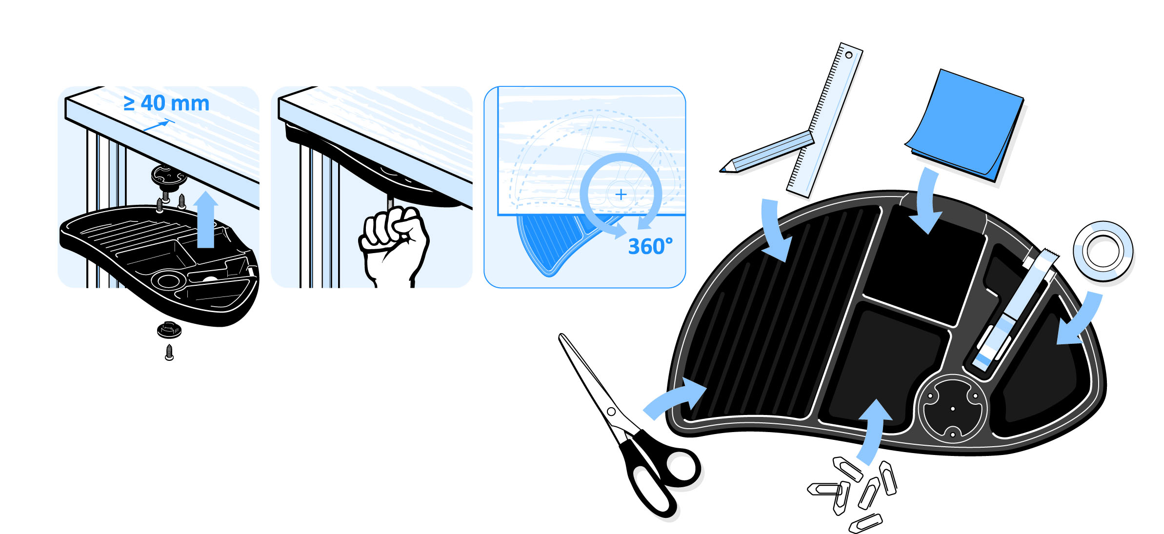 zur versteckten Aufbewahrung von Büromaterial in Greifnähe unter der Arbeitsplatte, mit Halter für Klebefilmabroller mit Kerndurchmesser 25,4 mm und Fach für Haftnotizzettel bis Größe 78 x 78 mm