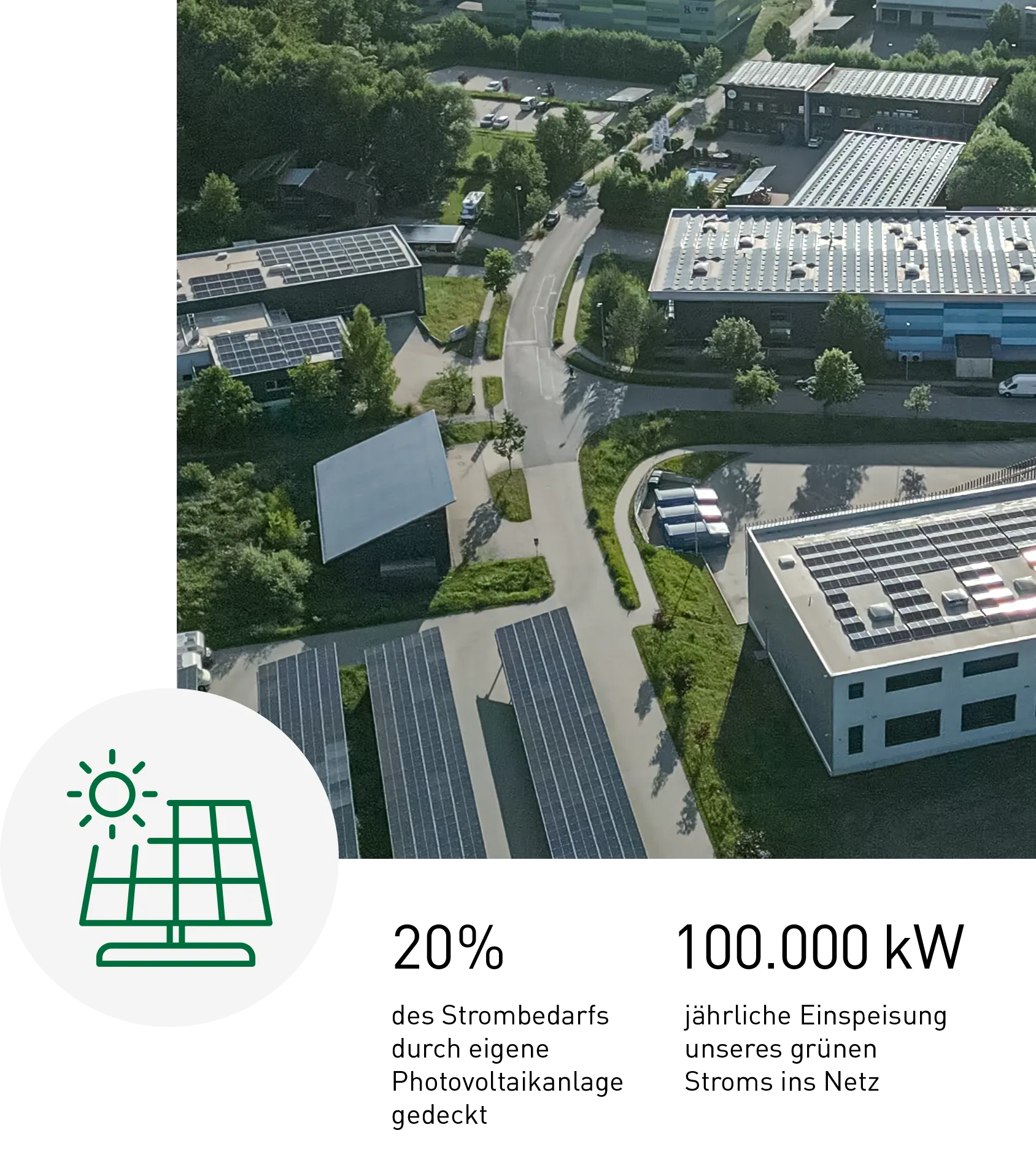Nachhaltige Energie ist für uns kein Zukunftsprojekt, sondern gelebter Alltag. Bereits in den letzten Jahren konnten wir rund 20 % unseres Strombedarfs durch unsere eigene Photovoltaikanlage decken – Tendenz steigend. Darüber hinaus speisen wir jährlich etwa 100.000 kWh grünen Strom ins Netz ein – ein aktiver Beitrag zur regionalen Energieversorgung.