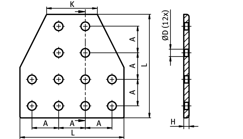 Verbinderplatte AL T 12-Loch, 2 Nuten