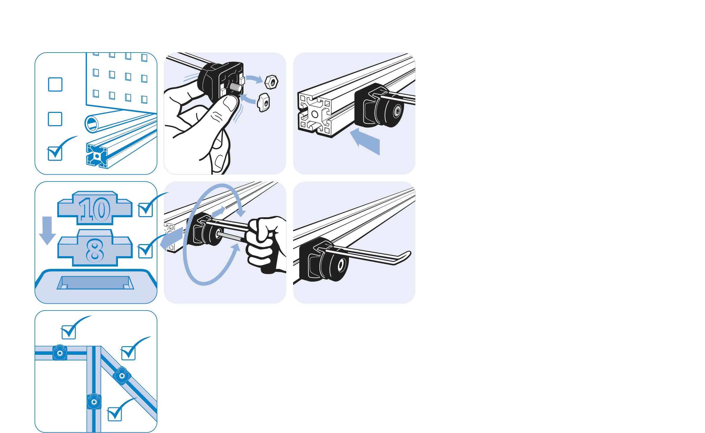 einsatzfertiger Werkzeughaken, 360° drehbar, für Aluminiumprofile