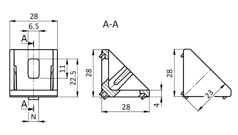 zur rechtwinkligen Verbindung von Profilen und Flächenelementen; die offene Seite des Winkels kann durch die Abdeckkappe verschlossen werden