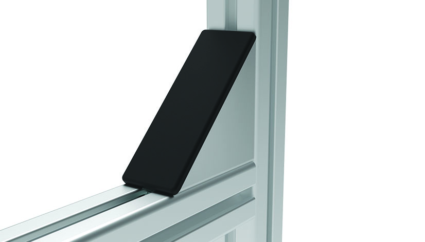 zur rechtwinkligen Verbindung von Profilen und Flächenelementen; die offene Seite des Winkels kann durch die Abdeckkappe verschlossen werden