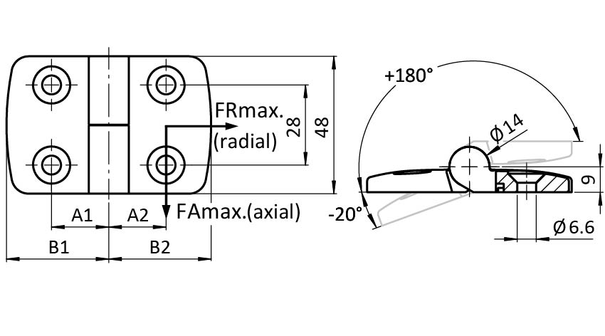 | Part # | A1 (mm) | Version | FAmax (N) | B1 (mm) | B2 (mm) | A2 (mm) | Combination | FRmax (N) |