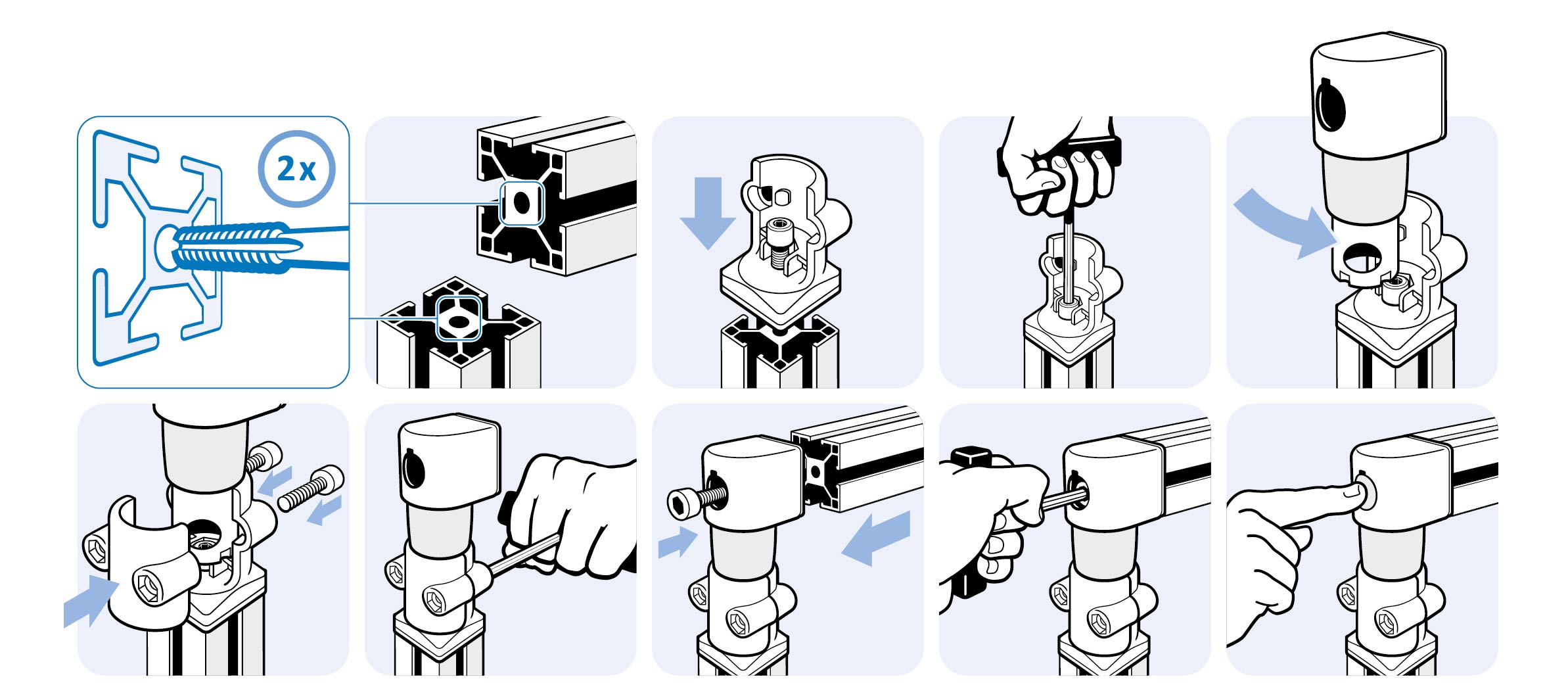 Friction joint side can be attached lateral, transverse, or on the face of the profile; if attached on the front face, the core hole of the respective profile must be M8 threaded (min. 15 mm deep)