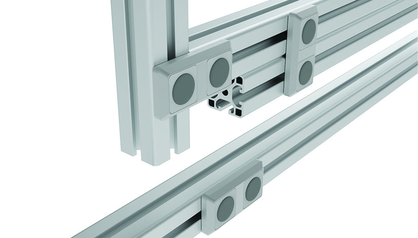 To connect two aluminum profiles quickly at right angle or parallel, direct inserting into the profile slot thanks to lengthwise or crosswise positioning of the pre-assembled magnet rhombus screws and counter sunk nuts with the 90° turnable inserts; the open screwing holes of the connection plate can be closed with the cover caps