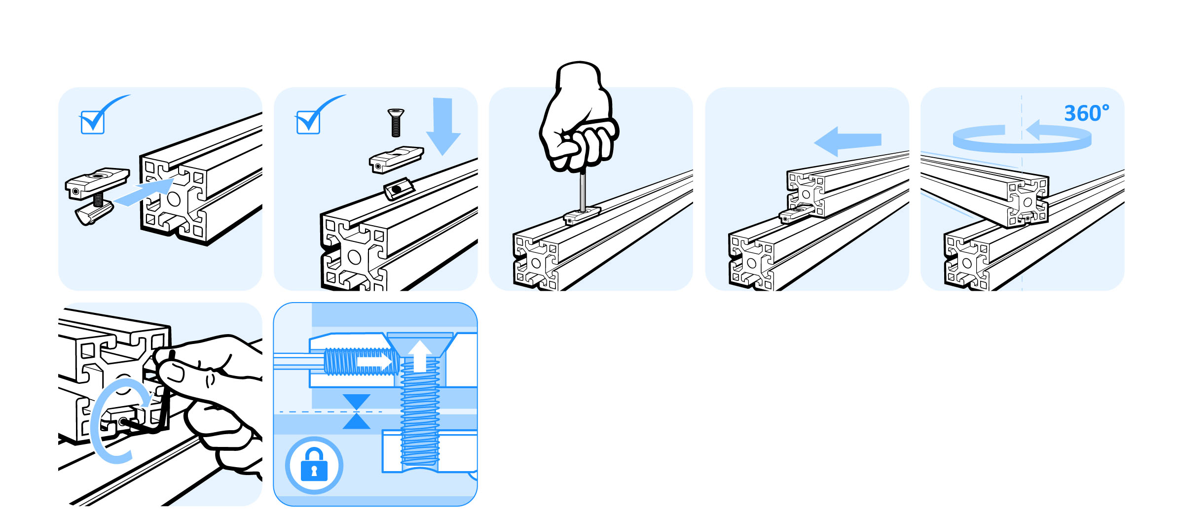 To cross or parallely connect two aluminum profiles slot 8 with slot 10; assembly without machining