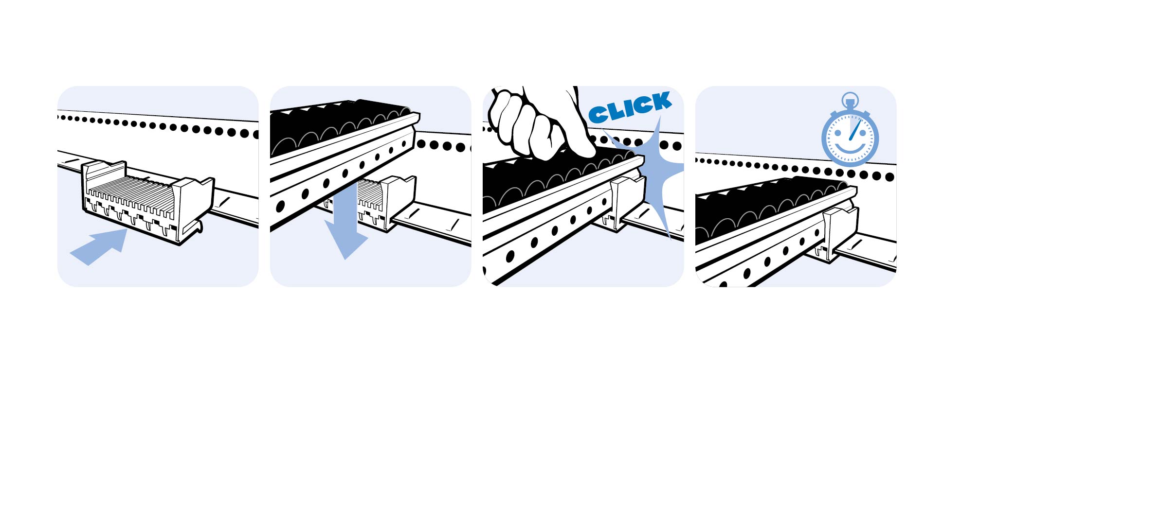 For quick plug-in of roller tracks I 60x24 in the lateral connectors of flow beds of live storage shelvings, channel width can be adjusted horizontally in steps
