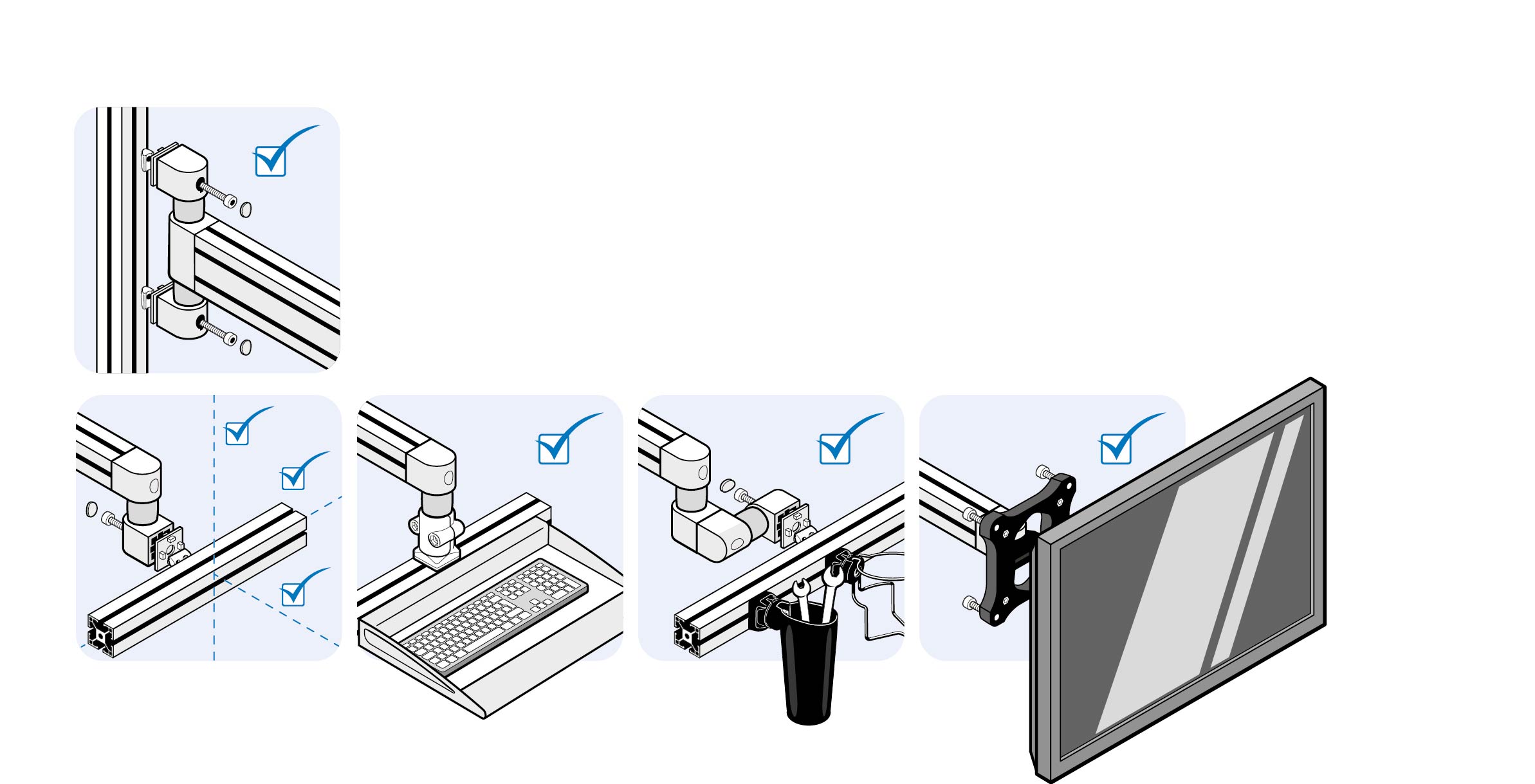 System arm can be attached lateral, transverse, or on the face of the profile; if attached on the front face, the core hole of the respective profile must be M8 threaded (min. 15 mm deep)