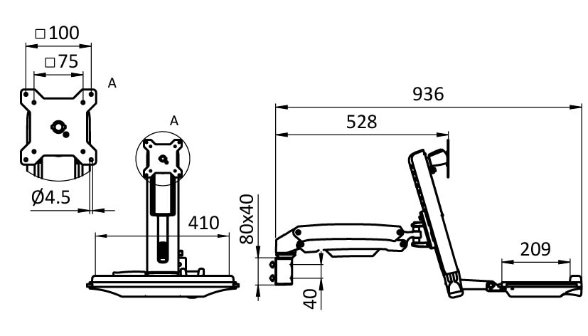 For mounting of monitors with 2 - 8 kg, mounting plate VESA MIS-D 75/100 compatible, adjustable viewing angle and height;