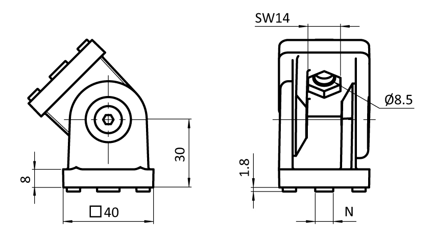 To make a pivoting connection between two profiles or panels; with separate locating pinsfor slot 8 and 10; by tightening or loosening the screws you can seamlessly regulate the functionality of the joint or you can fix it in one position