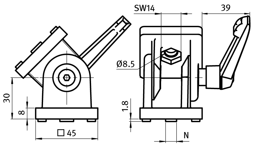 To make a pivoting connection between two profiles or panels which can be fixed at any angle; with separate locating pins for slot 8 and 10; by tightening or loosening the screws and the KIPP-locking lever you can seamlessly regulate the functionality of the joint or you can fix it in one position