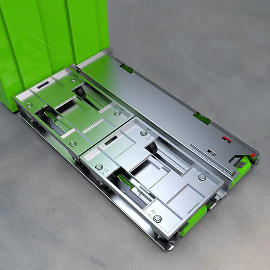 The FATH Adapter Pallet is the first pallet that can be transported with an AGV (driverless transport system). It has a sophisticated and very robust locking mechanism. The locking flap closes automatically when the adapter pallet is lifted one centimeter by a forklift, electric pallet truck or AGV. This also makes it possible to position rolling goods on inclined loading ramps or uneven production surfaces.