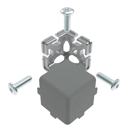 Matching gray plastic cover caps are included with all versions of the FATH Corner Connector with Cable Passage 2D and 3D. Simply place it on the connector, press it in place – done! This means that your profile constructions with power supply are also protected against cable chaos and damage from external influences. The assembly kit is also included in the scope of delivery.