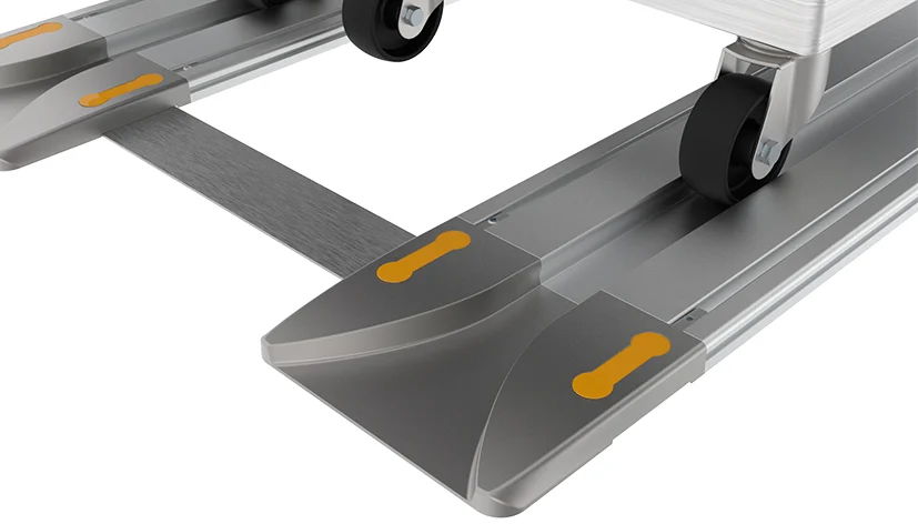 One guide rail per track is sufficient for the safe placement of the dollies. The side on which the Dolly is guided can be freely selected. For three tracks, for example, only three Guiding Rails are required. This reduces costs, saves space and offers additional flexibility.