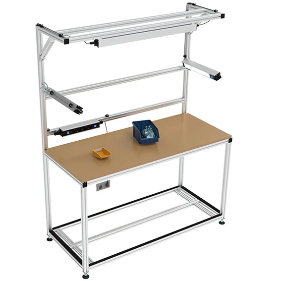 If two assembly workstations are to be supplied with power and light during production, you can, for example, equip both workstations with one LED lamp each and two power strips and connect all six modules with cables. The power is then supplied from one side in series. For example, if you use two 40-watt LED lamps, a total of 3,420 watts of power remains for the outlets. With the FATH solution for light and electricity, two facing work tables can be supplied compactly and at the same time with enough outlets for the power consumers.