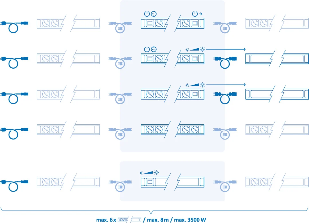 If you connect a FATH Power Strip to an LED lamp, you can remotely switch off the lamp using the large switch on the power strip. The power to the outlets can be disconnected by the switch but will still continue to flow through to the LED lamp. Even though the outlets are deactivated, the light supply is not affected. If several lights are connected in series on a single power strip, all the lights can be switched on and off with a single click of the switch. If directly dimmable LED lights are used, each light is dimmed as needed.