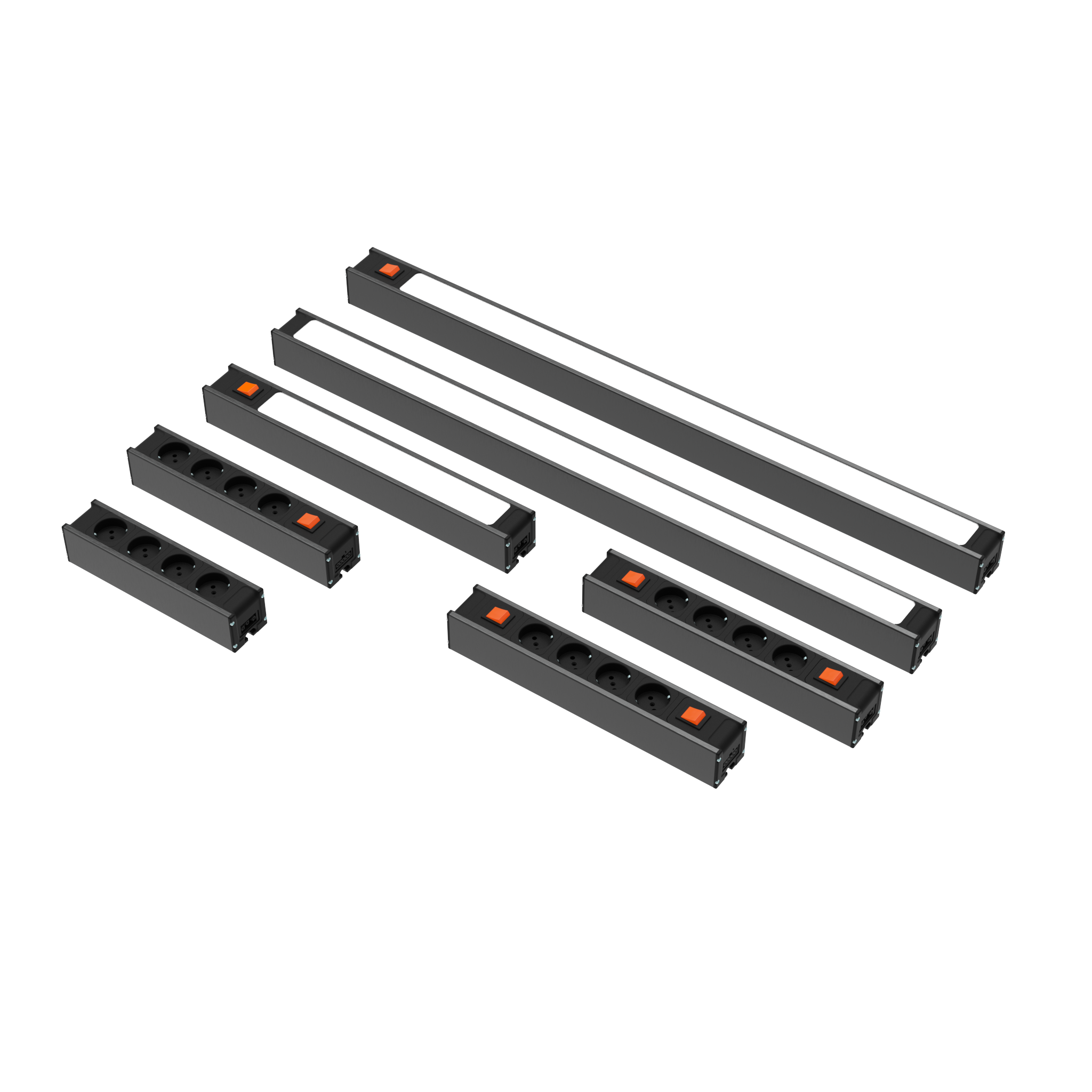 Power supply is an important aspect of workplace planning. It should be provided on the same surface or at the same height as the tabletop. The wiring should be stowed safely and protected from damage. This can be easily achieved with FATH Power Strips F Line – without long cables and with practical connections that can be easily installed in the frame.