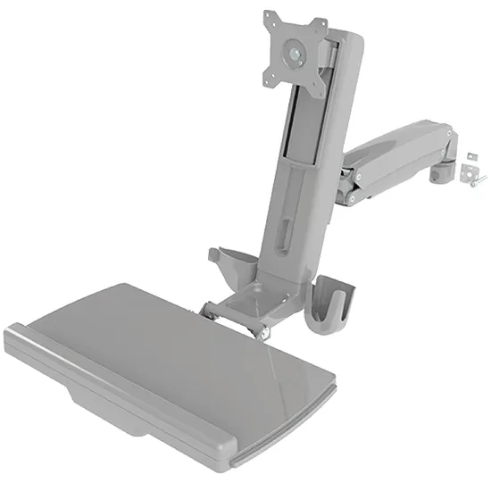 For adjustments, a practical recessed grip is integrated under the keyboard holder. When not in use, the entire monitor work station SIT / STAND can simply be pushed upwards or sideways, creating space at the workplace for all necessary work. The keyboard holder can also be folded up separately.