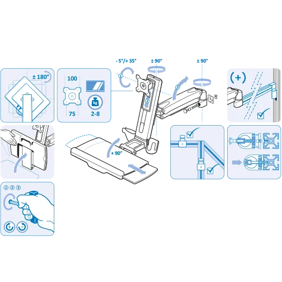 Four axis allow maximum flexibility: monitor and keyboard are infinitely height adjustable. Because the friction adjustment also makes tilting and swivelling 360° effortless, the tilt angle of the monitor and keyboard can be changed as desired. The screw-on joint halves can be mounted horizontally and vertically on profile systems 40 mm and higher.