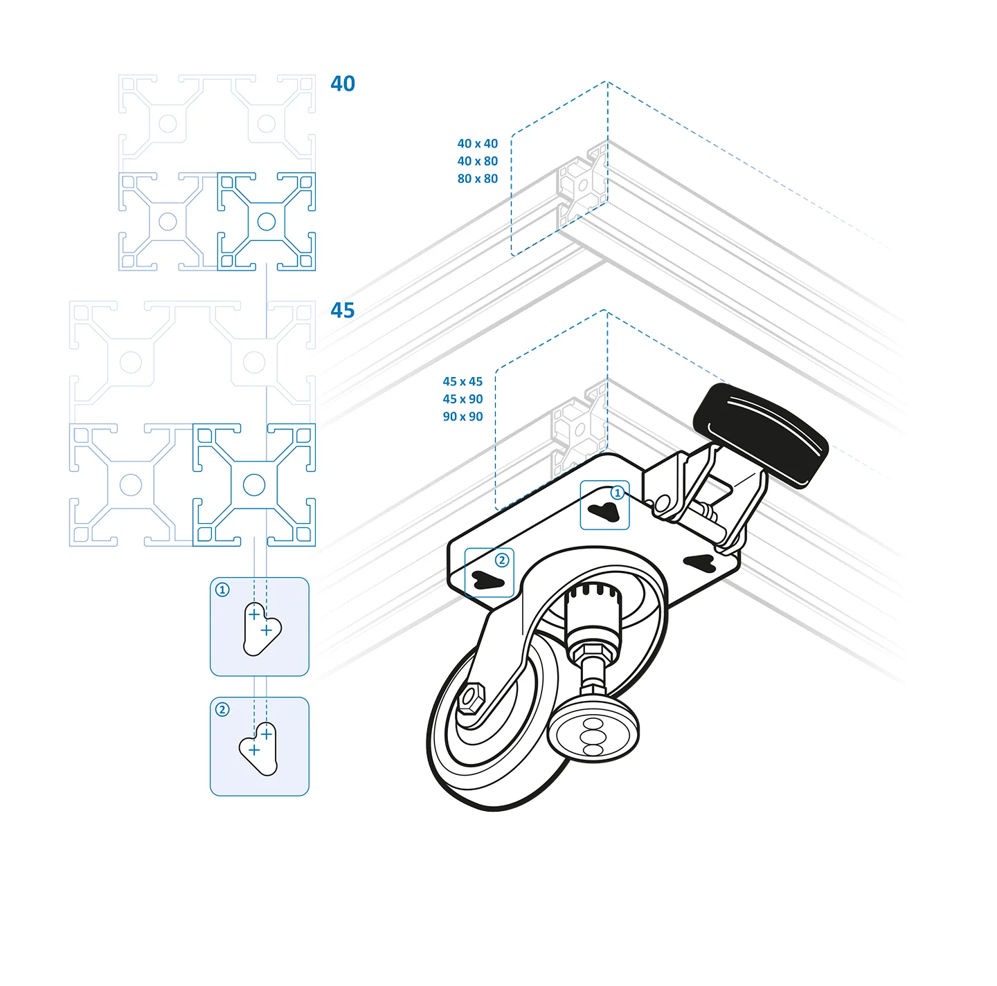 The FATH Swivel and Fixed Casters with Lifting Foot are ideally suited for modular dimensions 40 and 45 as well as right-angle profiles 40x80 and 45x90.