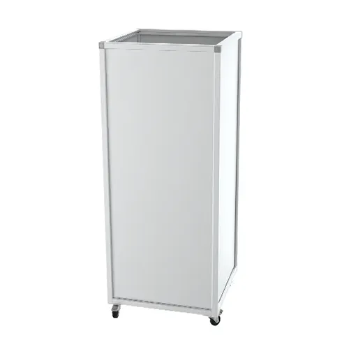 The metallic surfaces on the mobile enamel cube are also framed in 40x40 aluminum profiles. The visible sides of the profile are enclosed to protect against contamination and deposits.
