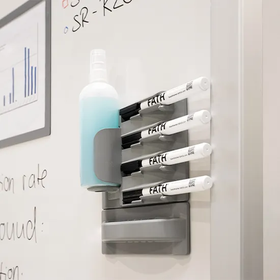 Board markers, cleaning agent and board erasers are neatly stored and are always handy where you need them. A marker is easily removed by twisting, while the cap remains in the UTENSILO and cannot get lost. Thanks to the magnets attached on the back, the UTENSILO sits securely on any magnetically adhesive, smooth surface. Left-handed users can adjust it to their needs by turning it 180°.