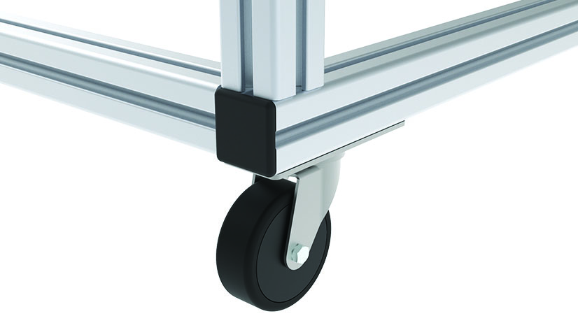 Reliable and quiet swivel caster, trackless (except solid rubber ESD electrostatical discharging), with ball bearings and thread guard; integrated mounting plate for asymmetric fixation to aluminum profiles without overhang; compatible with all swivel and fixed casters due to consistent height level; no additional transport and base plate needed; swivel caster either in standard version or as ESD electrostatical discharging version