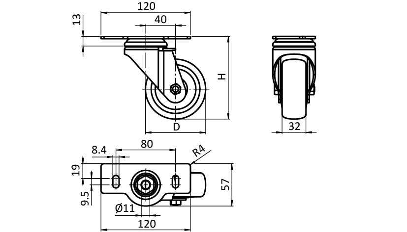 | Part # | D (mm) | ESD | H (mm) | Wheel Body | Max. Load (N) | Swivel Caster Tread |
