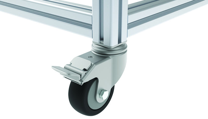 Reliable and quiet swivel caster, trackless (except solid rubber ESD electrostatical discharging), with ball bearings and thread guard; can be fixed to aluminum profiles; compatible with all swivel and fixed casters due to consistent height level with optional adapter plate S; no additional transport and base plate needed