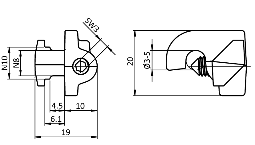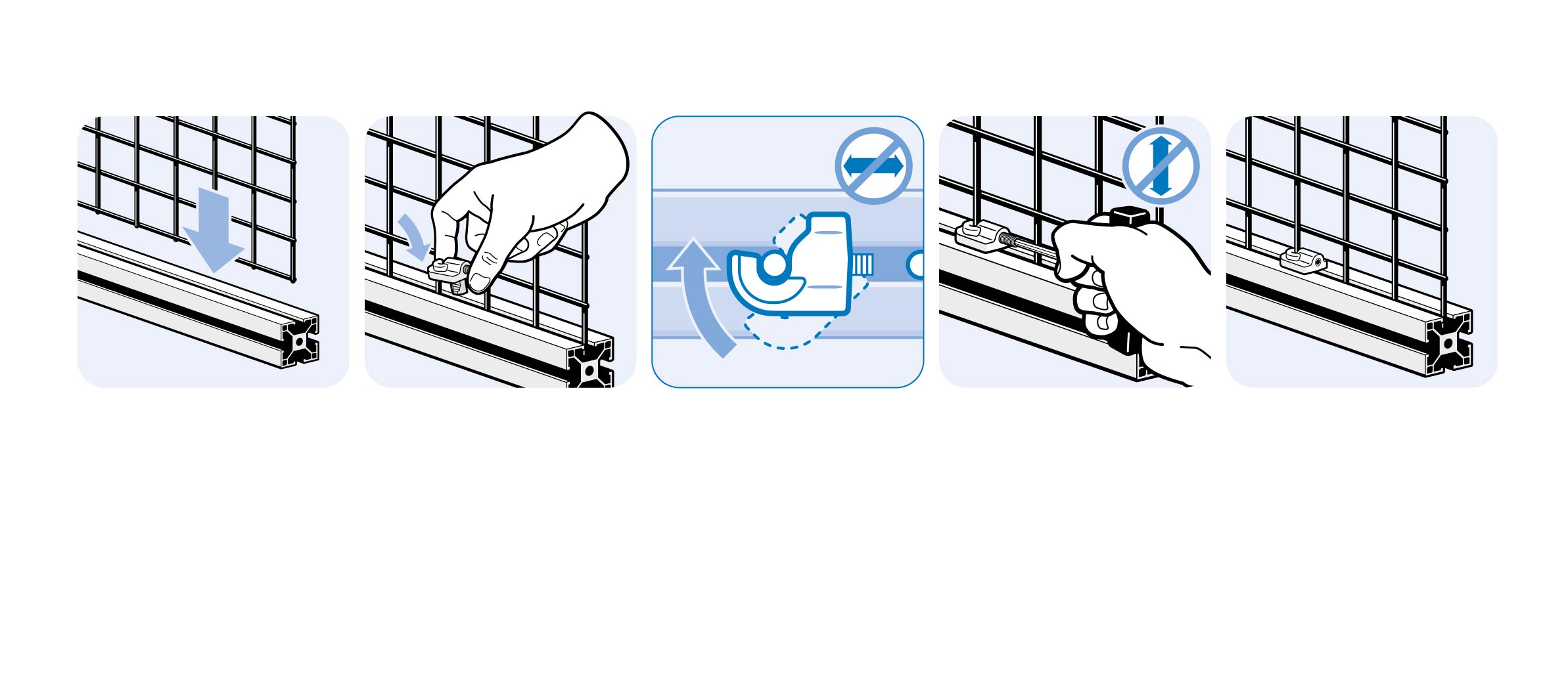 To fix protective wire mesh panels, clamping range 3 up to 5 mm (straight grate up to 5 mm, wave grate up to 4 mm), can be assembled on profiles with slot 8 and slot 10