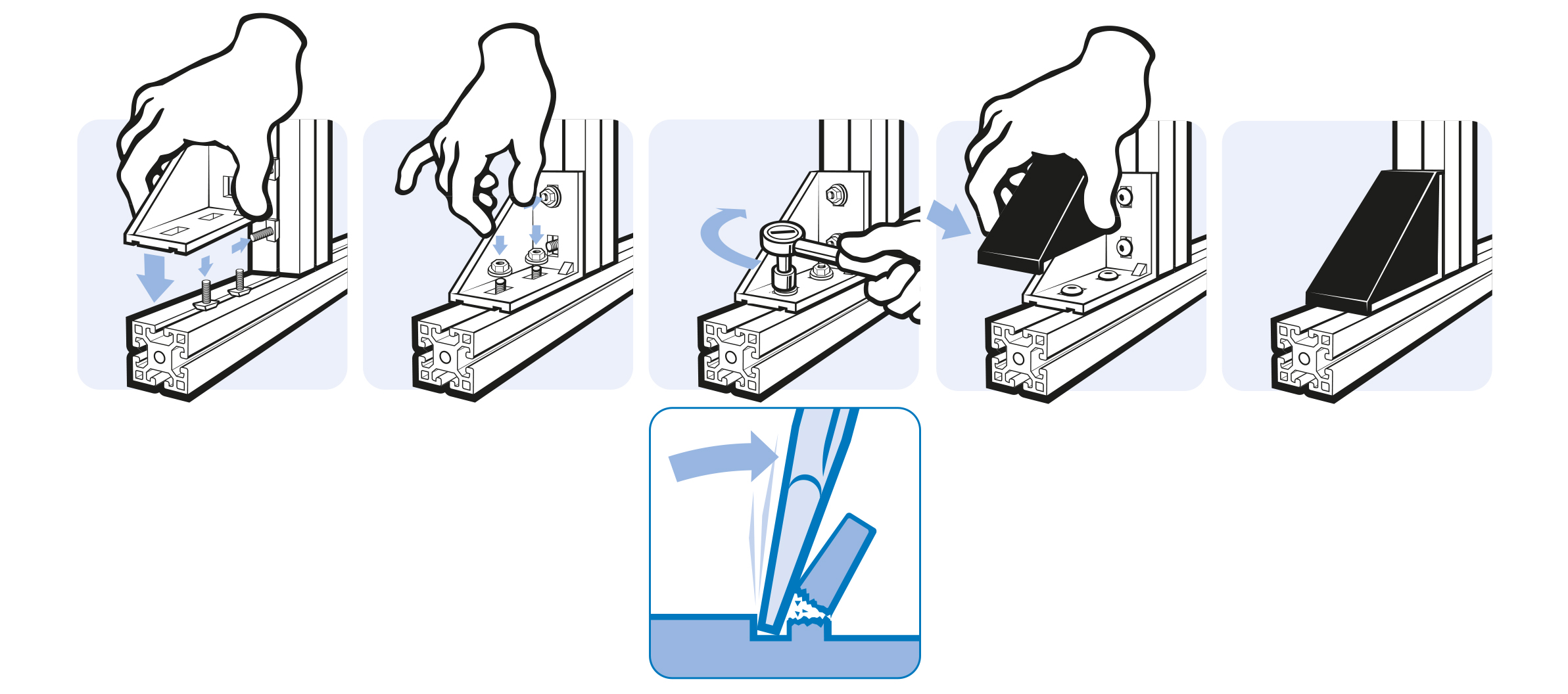 To connect two aluminum profiles or panels at right angles; the connection angle can be closed with the cover cap
